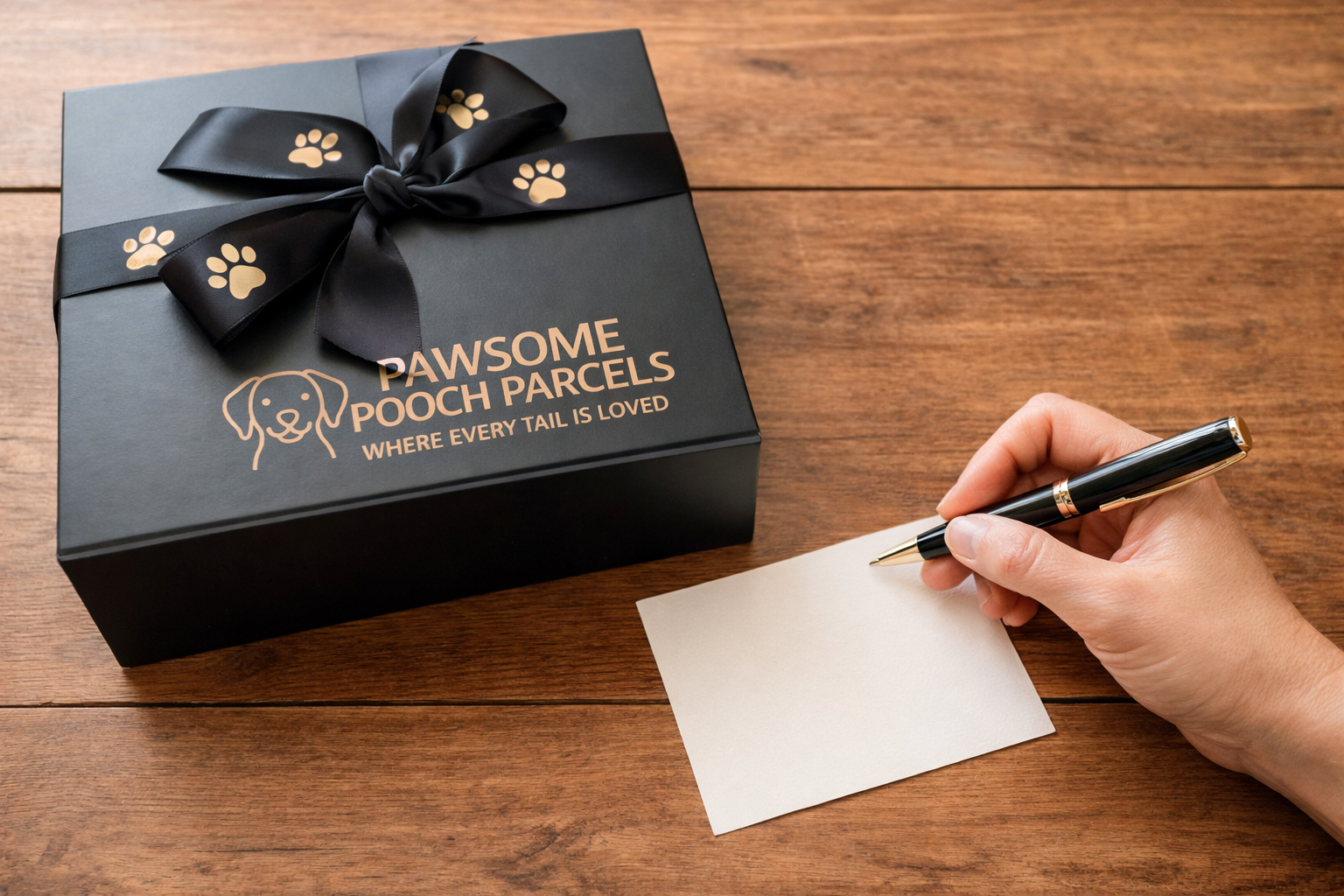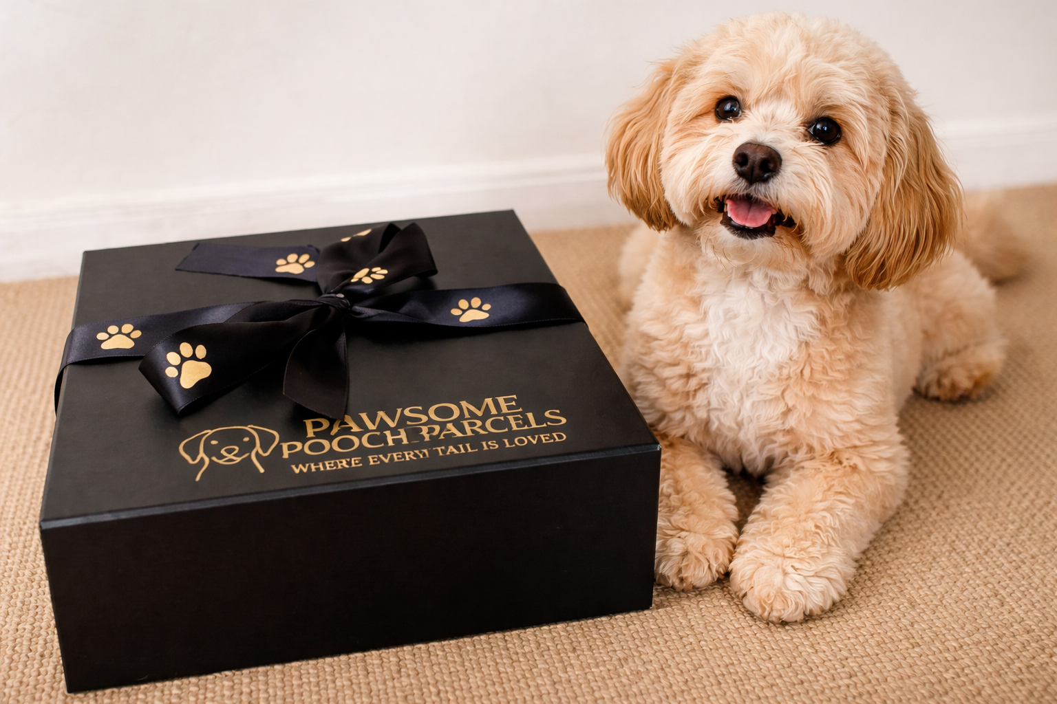 Each Pawsome Pooch Parcel is beautifully presented in our magnetic matte-black gift box, wrapped with a satin paw-print ribbon and thoughtfully styled to perfection.