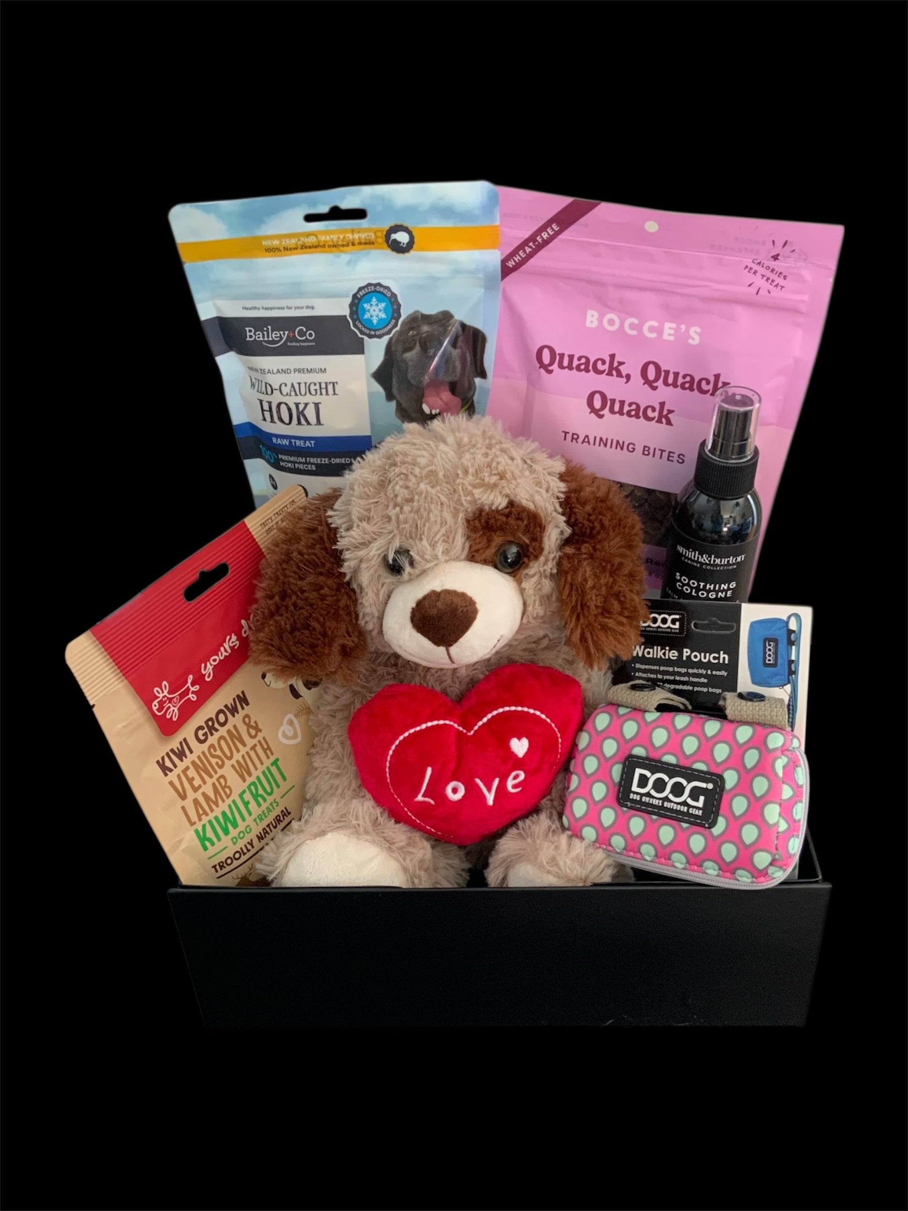 Every new adventure deserves a wagging tail! Treat that pooch to something special. Packed with delicious treats, a cuddly companion, and all the essentials for happy tail-wagging moments!